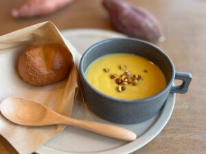 月替りスープランチ:旬の食材を活かしたスープと自家製パンやご飯とのセットを楽しめます。